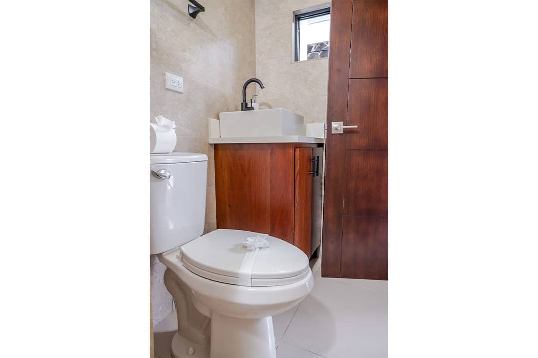 The room includes a modern private bathroom with a walk-in shower and hot water. Enjoy the convenience of Air Conditioning, free Wi-Fi, and access to a fully equipped shared kitchen and outdoor seating area—perfect for travelers who value design, comfort, and practicality in La Fortuna.